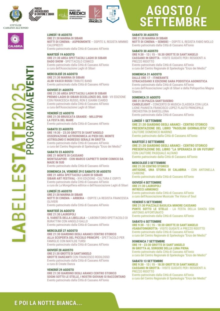 il testo degli eventi Programma Estate Laghi di Sibari 2025 Programma Estate cassano allo ionio 2025